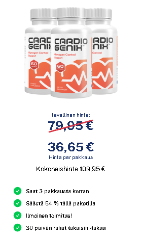 Tällä hetkellä voit tilata Cardio Genix -lisäravinteen 68 %:n alennuksella + ILMAISELLA toimituksella. Tämä on rajoitetun ajan tarjous, eikä se ole voimassa pitkään.